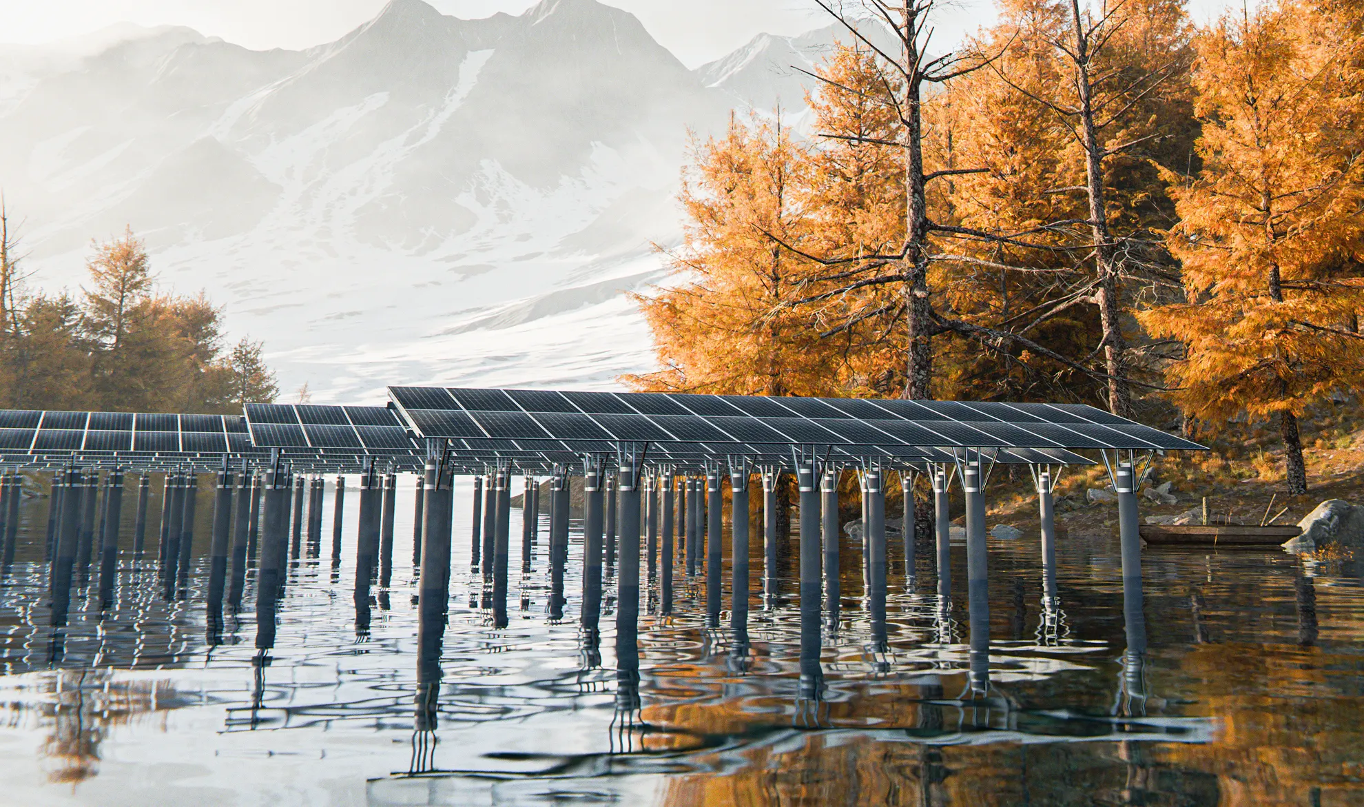 渔光互补支架系统专为鱼塘和湖泊等养殖水域光伏发电设计,系统通过在水面上方架设光伏阵列,构建“上可发电,下可养鱼”的新型发电模式,赋能渔业发展。